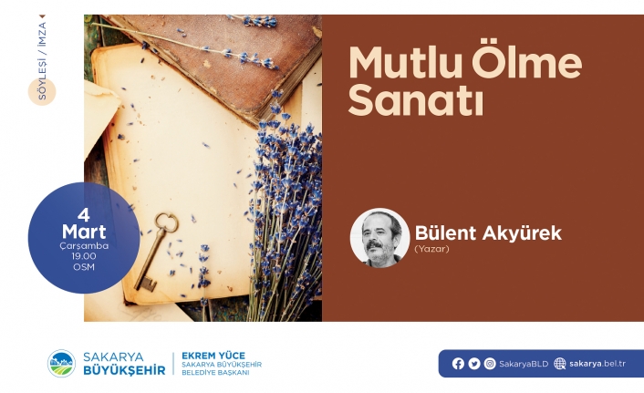 Sakarya Büyükşehir Belediyesi Mart Kültür Sanat Etkinlikleri ‘Mutlu Ölme Sanatı’ isimli söyleşi programı ile başlayacak. 4 Mart Çarşamba günü Ofis Sanat Merkezi’nde gerçekleştirilecek etkinlikte kültür sanat dostları ile buluşacak olan Yazar Bülent Akyürek program sonunda okurları için kitaplarını imzalayacak. Kültür ve Sosyal İşler Dairesi Başkanlığı’ndan yapılan açıklamada, “Mart Kültür Sanat Etkinlikleri ‘Mutlu Ölme Sanatı’ isimli söyleşi programı ile başlıyor. 4 Mart Çarşamba günü Ofis Sanat Merkezi’nde saat 19.00’da gerçekleştirilecek etkinliğe Yazar Bülent Akyürek konuşmacı olarak katılacak. Tüm hemşerilerimiz programa davetlidir” ifadelerine yer verildi.