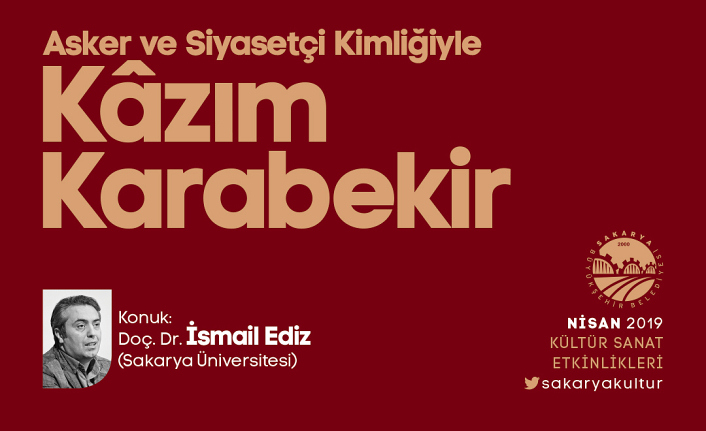 Sakarya Büyükşehir Belediyesi Nisan Kültür Sanat Etkinlikleri, 30 Nisan Salı günü gerçekleştirilecek ‘Asker ve Siyasetçi Kimliğiyle Kazım Karabekir’ başlıklı konferans ile devam edecek. Doç. Dr. İsmail Ediz’in konuşmacı olarak katılacağı konferans Ofis Sanat Merkezi’nde saat 20.00’da başlayacak. Kültür ve Sosyal İşler Dairesi Başkanlığı’ndan yapılan açıklamada, “Asker ve Siyasetçi Kimliğiyle Kazım Karabekir’ isimli konferans etkinliğimize tüm kültür sanat dostları davetlidir” denildi.