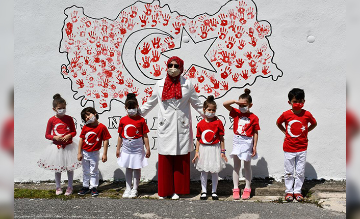 Okulun bahçesinde yapılan çekimler sırasında İl Millî Eğitim Müdürü Fazilet Durmuş, birer Türk bayrağı hediye ettiği minik öğrencilerle duvar üzerine çizilmiş Türkiye haritasına kırmızı boyalarla el baskısı yaptı.