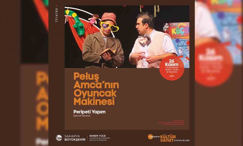 Sakarya Büyükşehir Belediyesi Kasım kültür sanat etkinlikleri tüm hızıyla devam ediyor. Bu kapsamda 26 Kasım Cumartesi günü saat 13.00 ve 15.00’da AKM’de çocuklar için tiyatro oyunu sahnelenecek. Peripeti Yapım tarafından hazırlanan ‘Peluş Amca’nın Oyuncak Makinesi’ isimli çocuk oyunu miniklere unutamayacakları bir gün yaşatacak. Kültür ve Sosyal İşler Dairesi Başkanlığından yapılan açıklamada, “Katılımın biletli olduğu ‘Peluş Amca’nın Oyuncak Makinesi’ isimi çocuk oyunu için biletlere www.sakarya.bel.tr adresinden ya da Kültür ve Sosyal İşler Dairesi Başkanlığımızdan temin edebilirsiniz” denildi.