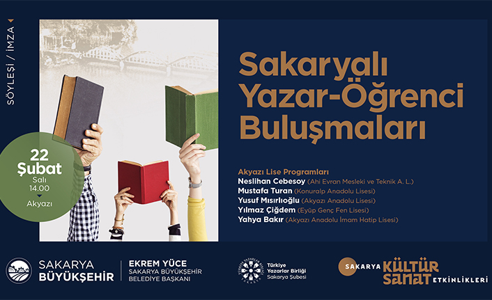 Yine 22 Şubat Salı günü diğer programlar Akyazı’daki 5 farklı lisede gerçekleştirilecek. Yazarlar Neslihan Cebesoy Ahi Evran Mesleki Lisesi’nde, Mustafa Turan Konuralp Anadolu Lisesi’nde, Yusuf Mısırlıoğlu Akyazı Anadolu Lisesi’nde, Yılmaz Çiğdem Eyüp Genç Fen Lisesi’nde ve Yahya Bakır Akyazı Anadolu İmam Hatip Lisesi’nde öğrencilerle söyleşi yapacak.