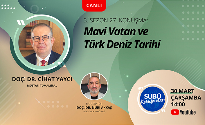 Sakarya Uygulamalı Bilimler Üniversitesi (SUBÜ) tarafından düzenlenen SUBÜ Konuşmaları’nın 27’inci konuşmacısı ‘Mavi Vatan ve Türk Deniz Tarihi’ başlıklı söyleşiyle Müstafi Tümamiral Doç. Dr. Cihat Yaycı olacak. Moderatörlüğünü SUBÜ Denizcilik Meslek Yüksekokulu Müdürü Doç. Dr. Nuri Akkaş’ın üstleneceği söyleşide; Mavi Vatan kavramının somut olarak ne ifade ettiği, neden üzerinde önemle durulduğu, askeri ve ekonomik bağlamda neleri ihtiva ettiği, Doğu Akdeniz’in paylaşım mücadelesi, Türk denizciliğinin serüveni ve denizciliğin neden önemli olduğu gibi konular konuşulacak. 30 Mart Çarşamba saat 14.00’te gerçekleştirilecek söyleşi üniversitenin YouTube kanalı SUBÜ Haber’den canlı yayınlanacak.