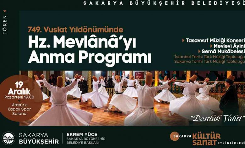 Sakarya Büyükşehir Belediyesi, Sakarya ve İstanbul Tarihi Türk Müziği Topluluğu işbirliğinde 19 Aralık Pazartesi günü akşamı saat 19.00’da Atatürk Kapalı Spor Salonu’nda  “749. Vuslat Yıldönümünde Mevlana’yı Anma Programı” gerçekleştirilecek.
