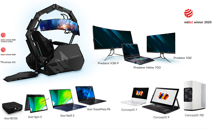 11 Acer ürünü, estetik ve yenilikçi ürün tasarımıyla toplamda 12 adet 2020 Red Dot ödülünün sahibi oldu. Oyunculara yönelik Predator serisi, dizüstü bilgisayarları, koltuk ve monitörleriyle en fazla ödül alan seri oldu. Predator Thronos Air oyuncu koltuğu ayrıca, sektörde yeni standartlar belirleyen ve temel değişimler başlatan ürünlere verilen Red Dot Yenilikçi Ürün ödülüne de layık görüldü[1]. İçerik üreticilere ve tasarımcılara yönelik ConceptD masaüstü ve dizüstü bilgisayarlar ise üç adet ödül aldı. Kalan ödüller ise Acer’ın profesyonel ve ince-hafif dizüstü bilgisayarları ile bir projektör modeli arasında dağıldı.