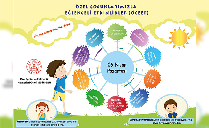 MEB Özel Eğitim ve Rehberlik Hizmetleri Genel Müdürlüğü tarafından il milli eğitim müdürlüklerine özel çocuklar için hazırlanan videolar ve görsellerden oluşan bir günlük eğitim programı gönderiliyor.