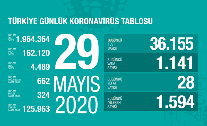 Toplam test sayısı 1 milyon 964 bin 364, toplam vaka sayısı 162 bin 120, toplam vefat sayısı 4 bin 489, toplam yoğun bakım hasta sayısı 662, toplam entübe hasta sayısı 324, toplam iyileşen hasta sayısı 125 bin 963 oldu.