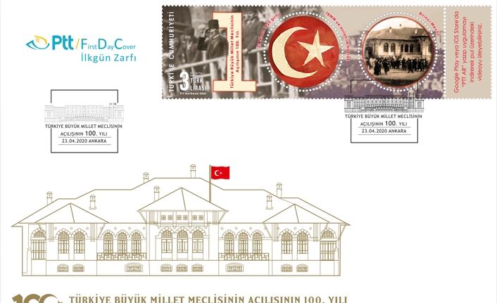 Posta ve Telgraf Teşkilatı Anonim Şirketi (PTT AŞ) 23 Nisan 2020 tarihinde “Türkiye Büyük Millet Meclisinin Açılışının 100. Yılı” konulu 3 TL (38×114 mm boyutunda) bedelli AR (Artırılmış Gerçeklik) uygulaması yer alan anma pulu, söz konusu pula ait (140×200 mm boyutunda) 5 TL bedelli ilk gün zarfı ve içerisinde 3×10 TL bedelli seri numaralı blok pulların (41×78 mm boyutunda) bulunduğu portföyü, 50 TL bedelle PTT iş yerlerinde, PTT’ye ait www.filateli.gov.tr web adresinde ve filateli cep uygulamasında satışa çıkardı.