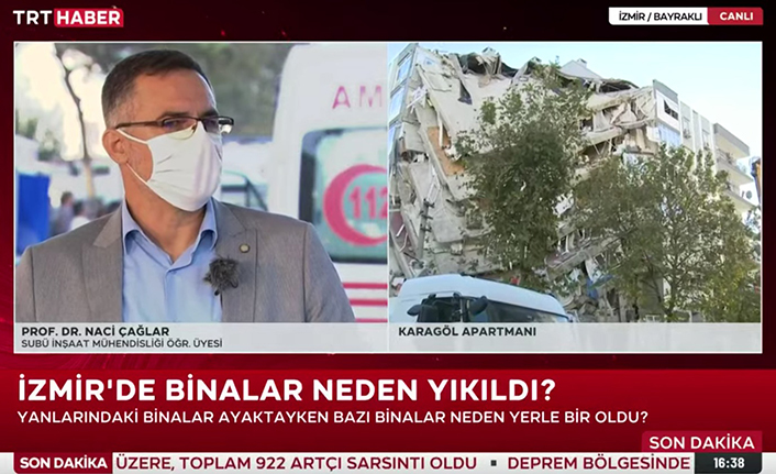 Sakarya Uygulamalı Bilimler Üniversitesi (SUBÜ) Deprem Çalışmaları Uygulama ve Araştırma Merkezi (DAMER) İzmir Depremi’nin ardından bölgede incelemelerini sürdürüyor. Rektör Yardımcısı Prof. Dr. Naci Çağlar, DAMER Müdürü Dr. Öğretim Üyesi Osman Kırtel, Teknoloji Fakültesi Dekan Yardımcısı Dr. Öğretim Üyesi İsa Vural, Dr. Öğretim Üyesi Yusuf Sümer ve Dr. Öğretim Üyesi Ali Sarıbıyık’tan oluşan heyet ilk incelemelerinin sonucunda elde ettikleri bulguları ise kamuoyuyla paylaşıyor. Bu doğrultuda TRT Haber canlı yayınına konuk olan Rektör Yardımcısı Çağlar ve DAMER Müdürü Kırtel depreme ve hasarına ilişkin değerlendirmelerde bulundu.