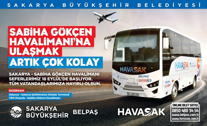Son model 5 araçlık filo ile hizmet sunmaya başlayacak ‘HAVASAK’ Sakarya Büyükşehir Belediyesi Şehirlerarası Otobüs Terminali’nden kalkış yapacak, son durakları ise Sabiha Gökçen Havalimanı olacak. Şehir genelinde Kent Meydanı, Terminal, Kampüs, Mavi Durak, Çark Caddesi, Şal Sokak ve Erenler Patates Hali ile Sabiha Gökçen Havalimanı olmak üzere toplam 8 şubede bilet kesim noktaları olacak. Online bilet satışları ise 0850 480 34 54 numarası ya da havasak.com.tr ile belpas.com.tr adresinden yapılacak.