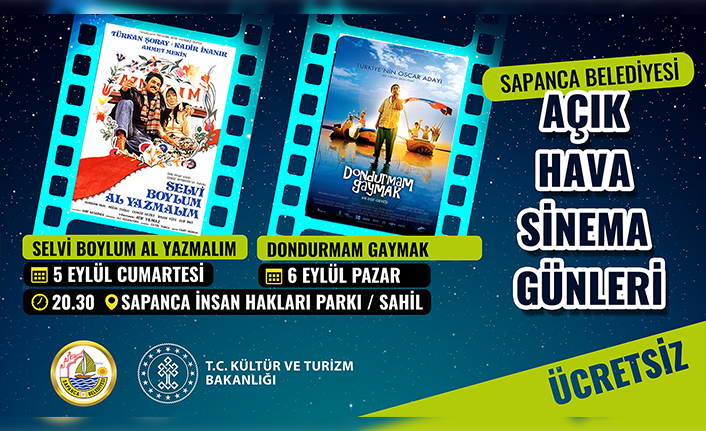 Sapanca Belediyesi Covid-19 tedbirleri kapsamında bu hafta sonu 5 Eylül Cumartesi “Selvi Boylum Al Yazmalım”, 6 Eylül Pazar “Dondurmam Gaymak” filmleri saat 20.30 da Sapanca İnsan Hakları Park’ında gösterime sunulacak..