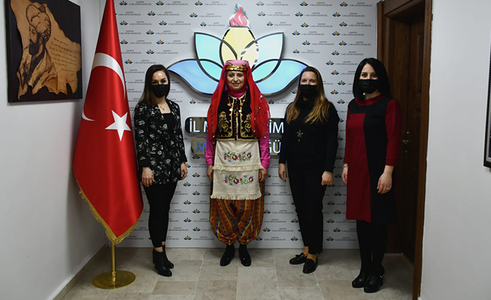 Halk Eğitim bünyesinde görev yapan giyim ve nakış öğretmenlerinin katıldığı projede el emeği göz nuru nakış nakış işlenen Sakarya Yöresine ait örnek kıyafet, İl Millî Eğitim Müdürü Fazilet Durmuş’a tanıtıldı.