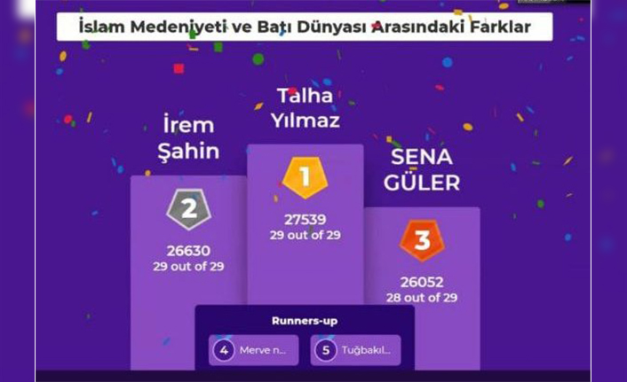 TÜGVA tarafından bu yıl 19.su düzenlenen çevrim içi yarışmada 29 sorudan 28’ine doğru cevap veren Şehit Yılmaz Ercan Kız Anadolu İmam Hatip Lisesi 12. sınıf öğrencisi Sena Güler’in yarışmaya katılan 500 öğrenci arasında kazandığı başarı büyük sevinç yarattı.