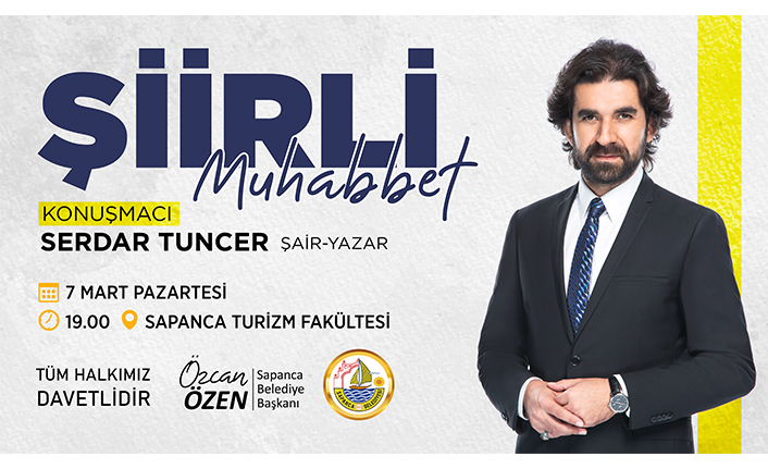 Sapanca Belediyesi, kültür sanat etkinlikleri kapsamında şair-yazar ve televizyon programcısı Serdar Tuncer’i konuk ediyor. Serdar Tuncer “Şiirli Muhabbet” konulu söyleşi programıyla 7 Mart Pazartesi günü saat 19.00 ‘da Sapanca Turizm Fakültesi Konferans Salonun da sevenleriyle buluşuyor.