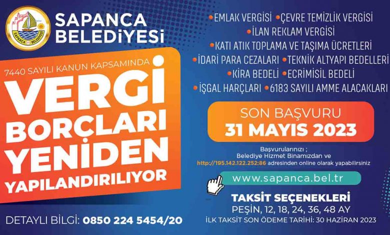 Kanun ile borçlu vatandaşların, 31 Aralık 2022 tarihinden önceki dönemlere, beyana dayanan vergilerde bu tarihe kadar verilmesi gereken beyannamelere ilişkin vergilere ve bunlara bağlı vergi cezalarına, gecikme faizlerine, gecikme zamlarına yeniden yapılandırma ile ödeme kolaylığı sağlanıyor. Söz konusu borçların gecikme ve cezalardan kaynaklanan artışları yeniden değerlendirilerek borçlar yapılandırılıyor. Kanun ayrıca borcu olan vatandaşlara, borçlarını peşin veya ayda bir ödenmek üzere 12 aydan 48 aya kadar taksitlendirme kolaylığı da sağlıyor. Peşin veya ilk taksit ödeme tarihi 30 Haziran 2023’ dür. Yapılandırmadan faydalanabilmek için borçlu vatandaşların 31 Mayıs 2023 tarihine kadar Belediye Emlak ve İstimlak Müdürlüğüne şahsen veya https://webportal.sapanca.bel.tr/web/guest/2 adresinden online başvuruda bulunmaları gerekmektedir.