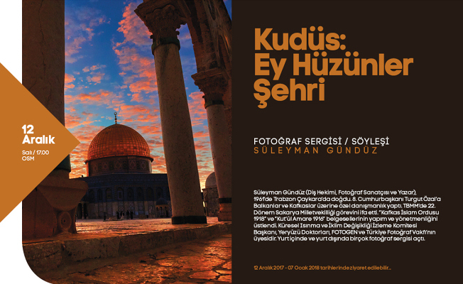 Sakarya Büyükşehir Belediyesi Kültür ve Sosyal İşler Dairesi Başkanlığı tarafından düzenlenen Aralık Kültür Sanat Etkinlikleri, ‘Kudüs: Ey Hüzünler Şehri’ fotoğraf sergisi ve söyleşi programı ile devam edecek. 12 Aralık Salı günü Ofis Sanat Merkezi’nde gerçekleştirilecek programda Sanatçı Süleyman Gündüz’ün objektifine yansıyan kareler kültür sanat dostlarının beğenisine sunulacak. Fotoğraf sergisinin açılışının ardından program Gündüz’ün söyleşisi ile devam edecek. Kültür ve Sosyal İşler Dairesi Başkanlığı’ndan yapılan açıklamada, “Saat 17.00’da başlayacak etkinliğe tüm kültür sanat dostları davetlidir” denildi. kocaali