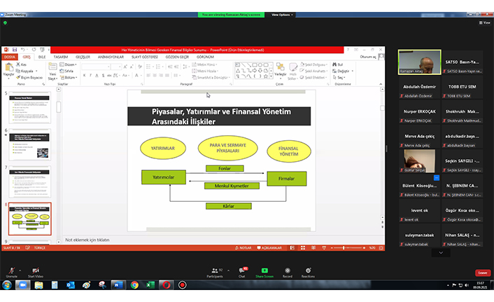 Bu bağlamda Odamız ve TOBB Ekonomi ve Teknoloji Üniversitesi Sürekli Eğitim Araştırma ve Uygulama Merkezi (TOBB ETÜ-SEM) işbirliğinde, İşletme Bölüm Başkanı Prof. Dr. Ramazan Aktaş’ın sunumuyla “Finansçı Olmayanlar İçin Finans” konulu online eğitim gerçekleştirildi.