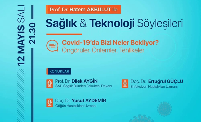 Koronavirüs tedavisi gören ve taburcu olan Doç. Dr. Yusuf Aydemir ise bu süreçte yaşadıklarını izleyicilerle paylaşacak. Saat 21:30’da başlayacak programa SAÜ Sağlık Bilimleri Fakültesi Dekanı Prof. Dr. Dilek Aygin de video konferans yoluyla katılacak.