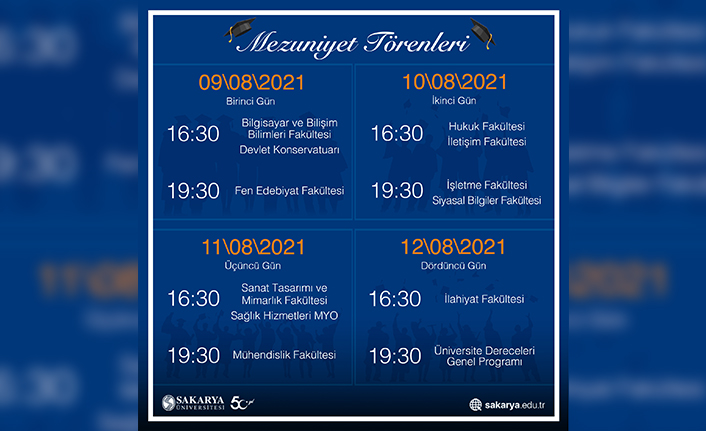 Koronavirüs salgını nedeniyle uzaktan eğitim gören Sakarya Üniversitesi son sınıf öğrencileri, mezuniyet için bir araya geliyor. Tıp ve Sağlık Bilimleri Fakültelerinin mezuniyetlerinden sonra diğer Fakülte ve Meslek Yüksekokulu öğrencilerimiz mezuniyet törenleriyle okullarına veda edecekler. Salgın nedeniyle mezuniyet töreni göremeyen 2020 mezunlarımız için de mezuniyet töreni düzenlenecek.