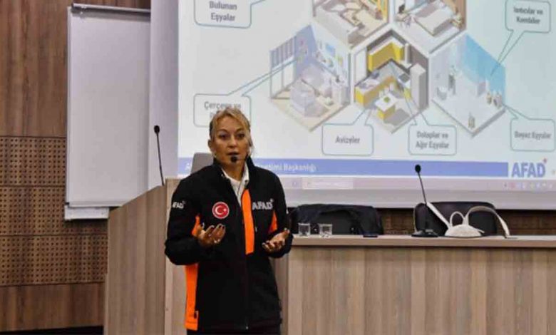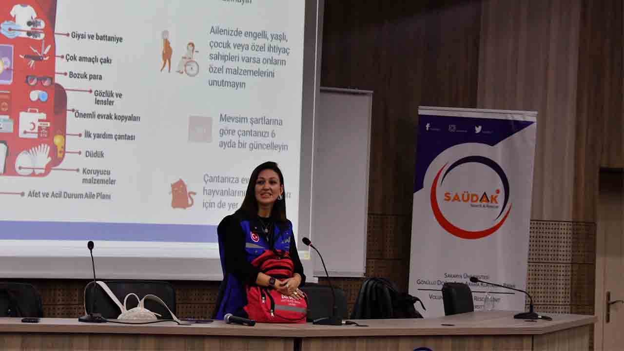 Sakarya AFAD İl Müdürlüğü’nde Jeofizik Mühendisi olarak görev yapan Zeliha Akçe afet anında profesyonel yardımın yanında kişinin kendisine ve çevresine yardım edebilmesinin öneminden bahsetti. Afetleri, afet zamanından öncesi, afet sırası ve afet sonrası şeklinde tanımlayan Akçe afet öncesinin yapılan eğitimler olabileceğini ve bu eğitimlerden sonra kişinin alacağı önlemleri vurguladı.