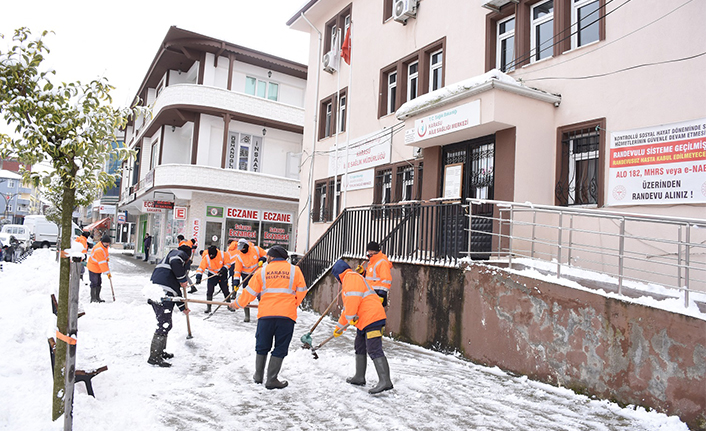 Karasu Belediyesi karla mücadele ekipleri, ilçeyi etkisi altına alan kar yağışıyla birlikte harekete geçti. Oluşturulan kriz masası koordinasyonu ile kar yağışı başlar başlamaz cadde ve kaldırımların temizliği için kullanılacak tüm iş makinaları sahaya indirildi. Ekipler bir yandan karla kaplanan yolları açarken bir yandan da kaldırımlardaki karları küredi.