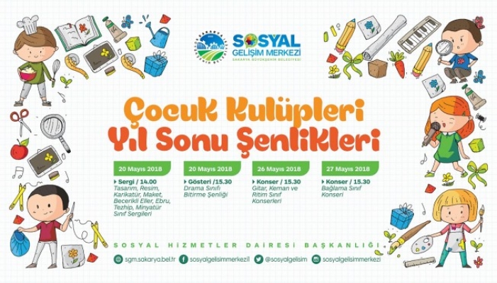 Sakarya Büyükşehir Belediyesi Sosyal Hizmetler Dairesi Başkanlığı tarafından düzenlenen Çocuk Kulüpleri Yıl Sonu Şenlikleri Adapazarı Sosyal Gelişim Merkezi’nde devam edecek. SGM’li miniklerin yıl boyunca yapmış olduğu el emeği eserler ve gösteriler Sakaryalılarla buluşacak. 20-26-27 Mayıs tarihlerinde düzenlenecek olan Çocuk Kulüpleri Yıl Sonu Şenlikleri; sergi, gösteri ve konserlerle bu dönem de dolu dolu geçecek. kocaali