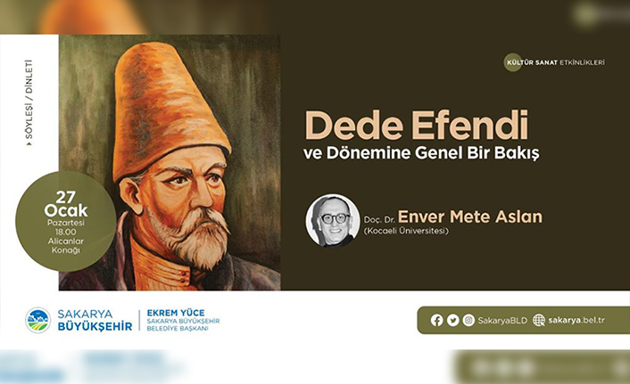 Sakarya Büyükşehir Belediyesi Kültür ve Sosyal İşler Dairesi Başkanlığı tarafından düzenlenen Ocak Kültür Sanat Etkinlikleri ‘Dede Efendi ve Dönemine Genel Bir Bakış’ konulu söyleşi ve dinleti programı ile devam edecek. 27 Ocak Pazartesi günü Alicanlar Konağı’nda gerçekleştirilecek olan programa Doç. Dr. Enver Mete Aslan konuşmacı olarak katılacak. Saat 18.00’da başlayacak program ile ilgili Kültür ve Sosyal İşler Dairesi Başkanlığı’nca yapılan açıklamada, ‘Dede Efendi ve Dönemine Genel Bir Bakış’ konulu söyleşi ve dinleti programına tüm kültür sanat dostları davetlidir” denildi.