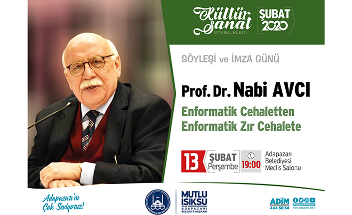 Adapazarı Belediyesi Kültür İşleri Müdürlüğü tarafından düzenlenen Şubat ayı kültür sanat etkinlikleri seçkin programlarla devam ediyor. Etkinlikler kapsamında Prof. Dr. Nabi Avcı, sevenleriyle buluşacak. Aynı zamanda eserlerini de imzalayacak olan Avcı’nın “Enformatik Cehaletten Enformatik Zır Cehalete” söyleşisi, 13 Şubat Perşembe günü saat 19.00’da Adapazarı Belediyesi Meclis Toplantı Salonu’nda gerçekleşecek.