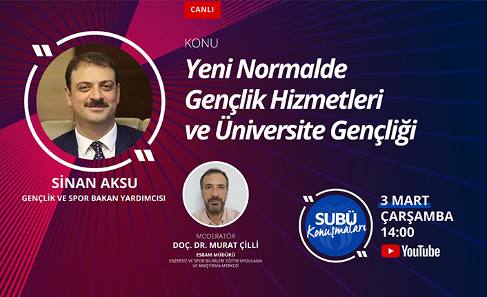 Sakarya Uygulamalı Bilimler Üniversitesi (SUBÜ) tarafından öğrencilerin akademik, sosyal ve kültürel gelişimlerine katkıda bulunmak; bilgi ve becerilerinin yanı sıra entelektüel donanımlarını da arttırmak amacıyla ‘SUBÜ Konuşmaları’ programı başlatılıyor. Herkese açık olacak ve Bahar Yarıyılı boyunca her Çarşamba saat 14.00’da gerçekleştirilecek program kapsamındaki etkinlikler, SUBÜ’nün YouTube kanalından canlı yayınlanacak. 3 Mart Çarşamba günü 14.00’da başlayacak programın ilk etkinliğine Gençlik ve Spor Bakan Yardımcısı Sinan Aksu, ‘Yeni Normalde Gençlik Hizmetleri ve Üniversite Gençliği’ başlıklı söyleşi ile misafir olacak. Aksu’nun katılacağı programın moderatörlüğünü ise Egzersiz ve Spor Bilimleri Eğitim Uygulama ve Araştırma Merkezi (ESBAM) Müdürü Doç. Dr. Murat Çilli üstlenecek.