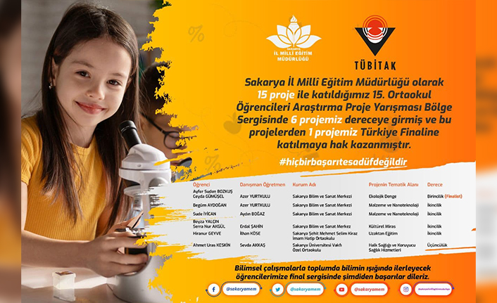Sakarya Millî Eğitim Müdürlüğünün 15 proje ile katıldığı bölge finalinde 6 projemiz derece kazanarak ilimize büyük gurur yaşattı.