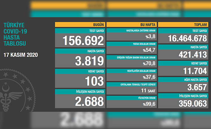 Sağlık Bakanlığının internet sitesinde yer alan ve Sağlık Bakanı Fahrettin Koca’nın paylaştığı “Türkiye Günlük Koronavirüs Tablosu’nun güncel verilerine göre, son 24 saatte 156 bin 692 test yapıldı. Verilere göre bugünkü hasta sayısı 3 bin 819 oldu.