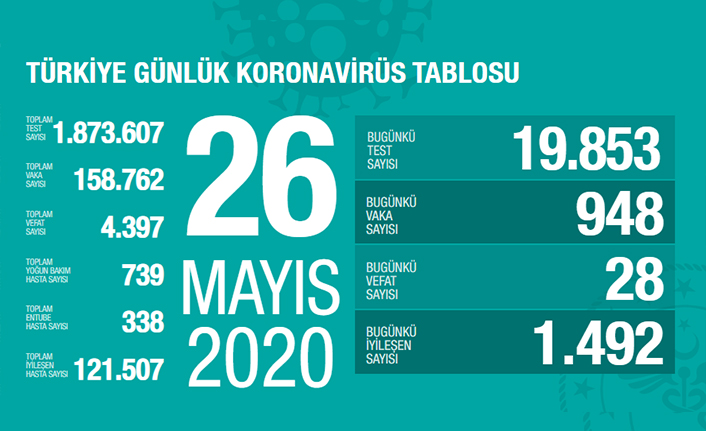 Toplam test sayısı 1 milyon 873 bin 607, toplam vaka sayısı 158 bin 762, toplam vefat sayısı 4 bin 397, toplam yoğun bakım hasta sayısı 739, toplam entübe hasta sayısı 338, toplam iyileşen hasta sayısı 121 bin 507 oldu.