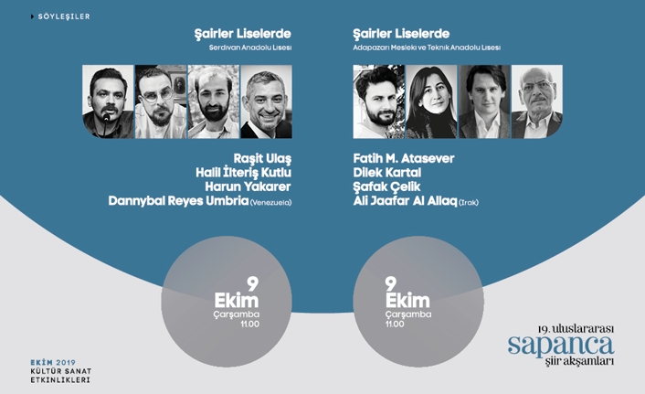 Sakarya Büyükşehir Belediyesi 19. Uluslararası Sapanca Şiir Akşamları, 9 Ekim Çarşamba günü gerçekleştirilecek etkinliklerle devam edecek. Saat 11.00 ve 14.00’da katılımcı şairler farkı okullarda öğrencilerle buluşacak. Günün sonunda ise 18.00’da Sapanca’da şairlerin şiir sunumları ve Atakan Akdaş’ın dinletisiyle 19. Uluslararası Sapanca Şiir Akşamları sona erecek.