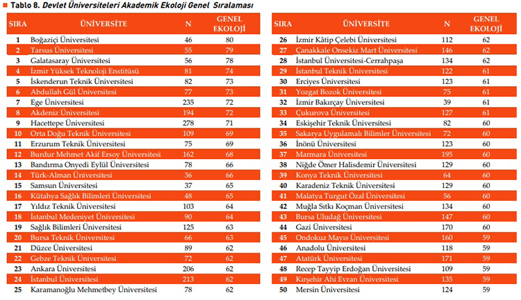 Sakarya Uygulamalı Bilimler Üniversitesi (SUBÜ), Üniversite Araştırmaları Laboratuvarı (ÜniAr) tarafından devlet ve vakıf üniversiteleri olmak üzere 194 üniversiteden akademisyenlerin görüşleri temel alınarak yapılan ‘Akademik Ekoloji: Akademisyenlerin Gözünden Üniversiteler’ başlıklı değerlendirme sonuçlarına göre devlet üniversiteleri arasında akademik ekoloji bakımından ön sıralarda yer aldı. Araştırmada akademisyenlerin görüşleri doğrultusunda toplam 11 alanda değerlendirme yapıldı.