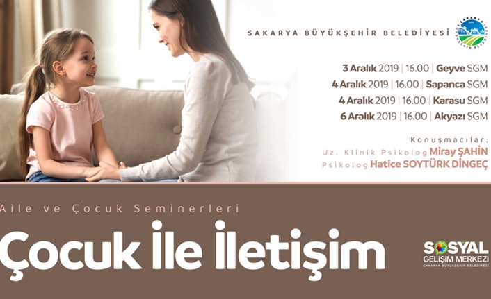 Sakarya Büyükşehir Belediyesi Sosyal Hizmetler Dairesi Başkanlığı Aile Danışma Birimi tarafından aile ve çocuk seminerleri düzenlenecek. Geyve, Sapanca ve Akyazı SGM’de ‘Çocuk ve İletişim’ konulu seminerlerde Uzman Klinik Psikolog Miray Şahin, Karasu SGM’de gerçekleştirecek seminerde ise Psikolog Hatice Soytürk Dingeç konuşmacı olarak yer alacak.