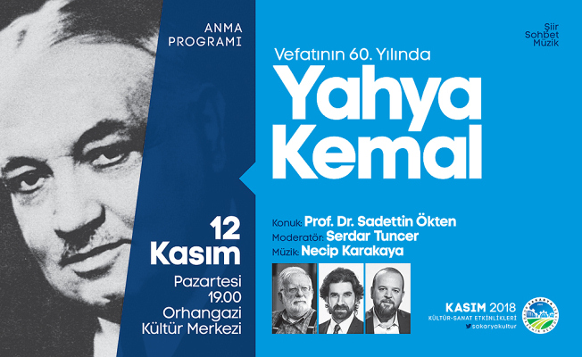 Sakarya Büyükşehir Belediyesi Kasım Kültür Sanat Etkinlikleri Yahya Kemal’in vefatının 60. yıldönümü dolayısıyla düzenlenecek anma programıyla devam edecek. Şiir, sohbet ve müziğin bir arada olacağı programda Prof. Dr. Sadettin Ökten Yahya Kemal’i anlatacak. Moderatörlüğünü Şair Serdar Tuncer’in üstleneceği programda Necip Karakaya müzik dinletisi sunacak. Kültür ve Sosyal İşler Dairesi Başkanlığı’ndan yapılan açıklamada, “12 Kasım Pazartesi günü saat 19.00’da Orhangazi Kültür Merkezi’nde şiirin, sohbetin ve müziğin bir arada olacağı programımıza tüm kültür sanat dostları davetlidir” ifadelerine yer verildi.