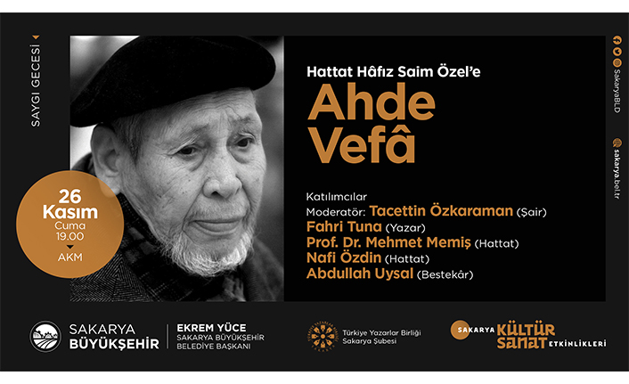 Hattat Hafız Saim Özel’e Ahde Vefa programının moderatörlüğünü Tacettin Özkaraman üstlenecek. Konuşmacılar ise Fahri Tuna, Nafi Özdin, Abdullah Uysal ve Prof. Dr. Mehmet Memiş olacak. Türkiye Yazarlar Birliği Sakarya Şubesi iş birliğiyle düzenlenecek etkinlik 26 Kasım Cuma günü saat 19.00’da AKM’de gerçekleştirilecek. Taraklı’da dünyaya gelen Hattat Saim Özel’in yaşamı, eserleri, hat sanatı ve diğer yönleri saygı gecesinde konuşulacak.